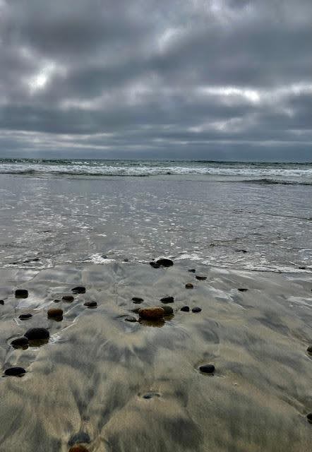 Walking along the shore today, peacefully taking in the rhythmic sounds of the waves, the beauty of the brilliant gray sky, the colorful tumbled stones upon the shore…