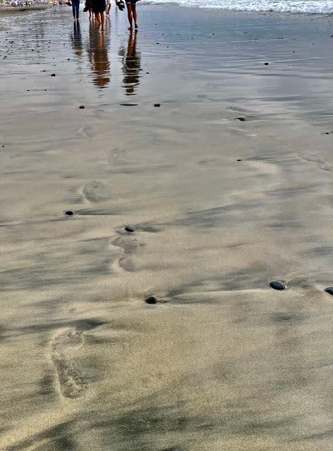 The young people ahead of me were laughing and enjoying themselves and just then a sneaky wave wrapped round my ankles. As I looked down the footprints in front of me were swept away. In an unexpected instant they were gone. And it came to me that the marks we make on this world are fleeting.